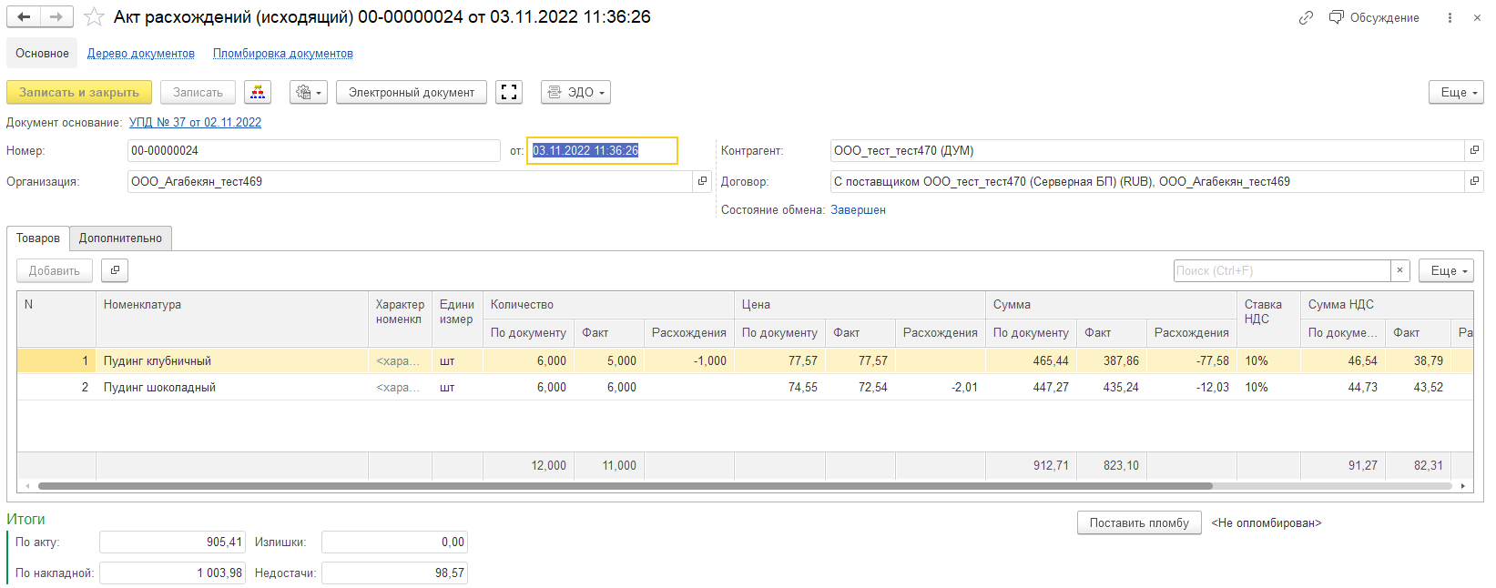 По таким УПД с расхождениями можно создать исходящий электронный документ "Акт расхождений" или сформировать печатную форму Акта расхождений и любым удобным способом передать ее поставщику.