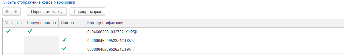 Если в документ была считана упаковка, по которой не был получен состав агрегата, то для получения состава можно воспользоваться командой «Получить состав упаковок» из меню «Все действия» либо включить соответствующее регламентное задание. После получения состава в колонке "Получен состав" будет проставлен флаг. При этом состав агрегата в ТЧ не выводится. Для просмотра состава можно воспользоваться паспортом марки.