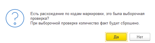 Если пользователь отвечает ДА, то движение в контуре факт будет по всем имеющимся в документе маркам, то есть они будут соответствовать движениям по контуру ИС МП. Аналогичное движение будет, если марки вообще не считывались.