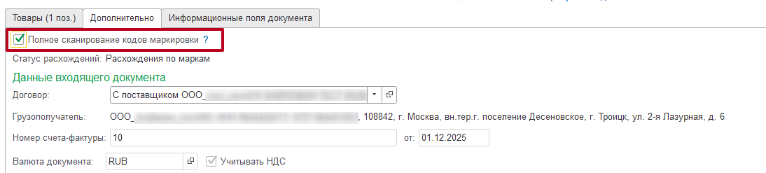 Если НЕТ — на закладке «Дополнительно» проставляется флаг Полное сканирование кодов маркировки и в движениях будут участвовать только считанные марки.