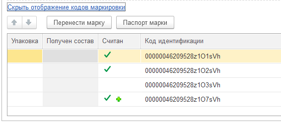 Если в ходе считывания будет выявлен пересорт, то колонки «Количество» и «Количество факт» не совпадут, расхождения будут видны в таблице кодов маркировки.