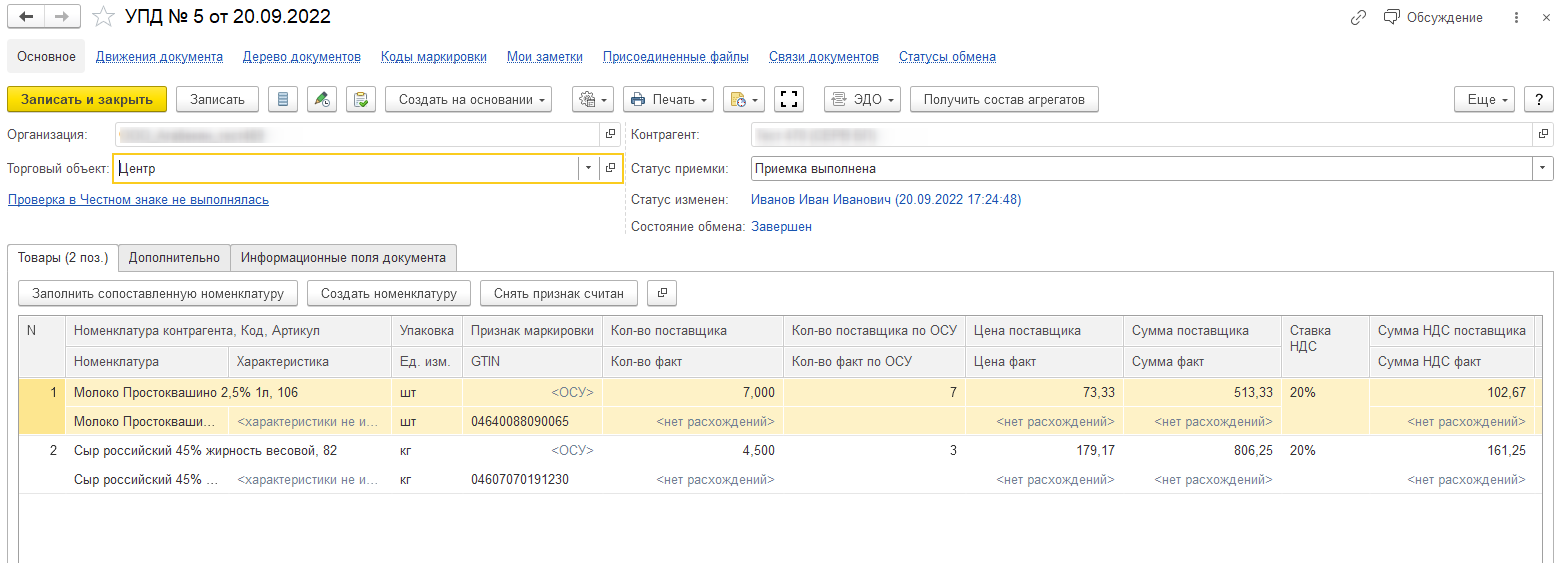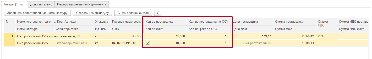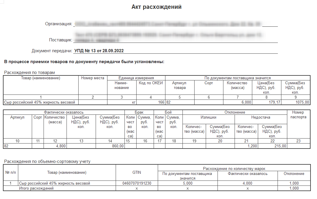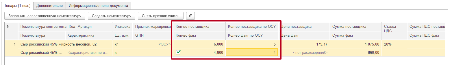 На приведенном ниже примере по данным поставщика отправлено 5 кодов (маркируется голова сыра) общим весом в 6 кг. По факту оказалось что пришло 4 головы общим весом 4,8 кг.