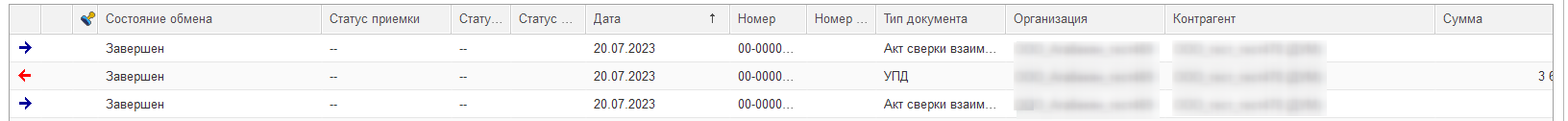 В форме списка документов статусы проверки отображаются в отдельной колонке. По неподписанным УПД, УПДи: Проверка пройдена (пред) или Ошибка проверки (пред). Если документ не подлежит проверке или ещё не прошёл её, статус не отображается. По всем подписанным УПД, УПДи, УКД: Обработан или Ошибка обработки.