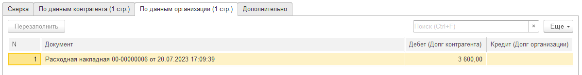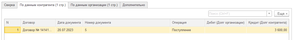 Если договор определился автоматически, то табличная часть "По данным организации" также заполнится автоматически. Если же договор определить не удалось, то табличную часть "По данным организации" необходимо будет заполнить.