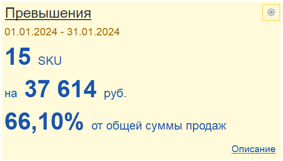 - Превышения — показатель отражает выявленные превышения по продажам за указанный период. В первой строке указывается количество SKU, по которым зафиксированы превышения. Во второй - сумма превышений (рассчитывается в той категории цен, которая будет выбрана в настройках мониторинга). В третьей - процент превышений от общей суммы продаж за выбранный период по выбранному складу. По гиперссылке в заголовке можно перейти к отчету Превышения номенклатуры (без группировки).