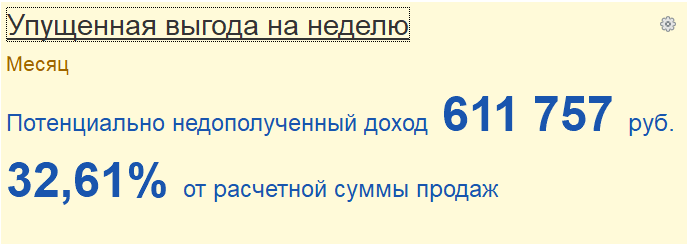 - Упущенная выгода на неделю — показатель позволяет оценить возможные потери за следующую неделю при отсутствии товара на складе. Также отображается информация о процентном соотношении потенциальных потерь и потенциальных продаж за неделю. Период, который вы указываете в настройках виджета, это период для расчета средних продаж, на основе которых далее рассчитываются потенциальные продажи и потери. Сумма рассчитывается в той категории цен, которая будет выбрана в настройках мониторинга. По гиперссылке в заголовке можно перейти к отчету Out-of-stock.