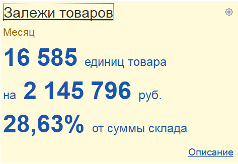 - Залежи товаров — показатель позволяет выявить товары, которые не продаются в течение длительного времени. В первой строке указывается количество единиц товаров, которые не продаются в течении указанного периода, при этом были в наличии на складе весь указанный период времени. Сумма указывается в закупочных ценах. Процент показывает суммы залежей от общей суммы товаров склада. По гиперссылке в заголовке можно перейти к отчету Залежи товаров в закупочных ценах - это вариант отчета Залежи товаров. Если у вас несколько организаций и включен учет партий по организациям, то товар который продавался в заданный период хотя бы по одной из организаций не будет считаться залежами.