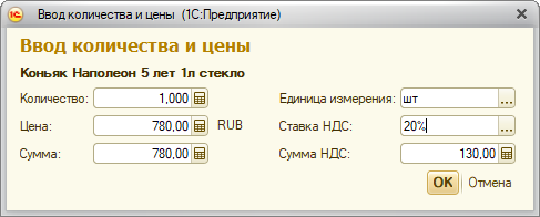 Товары для добавления в документ выбираются из списка в правой части формы. Если активна кнопка , при выборе товара будет всплывать окно, в котором указывается количество/цена для ввода в документ.