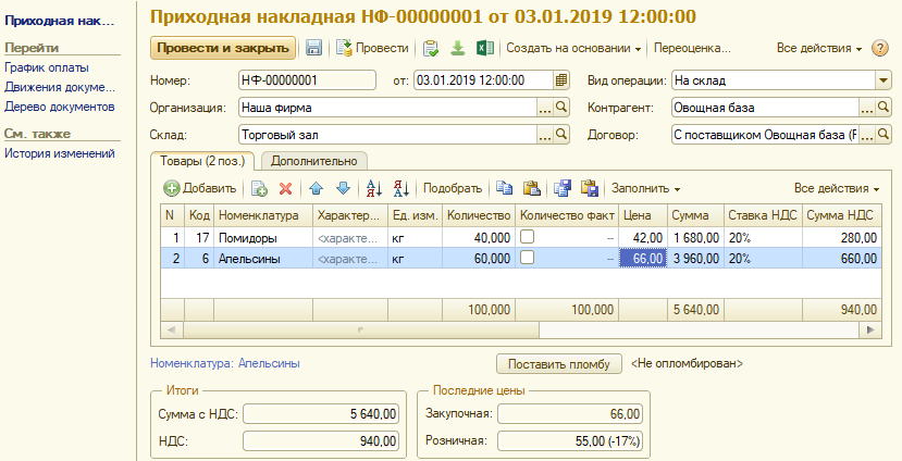 Каждый документ в программе имеет основную часть, в которой отображается его «шапка» с наименованием, номером, датой и другими данными. Ниже «шапки» располагается табличная часть и, если есть, дополнительные закладки. В левой части находится панель навигации.