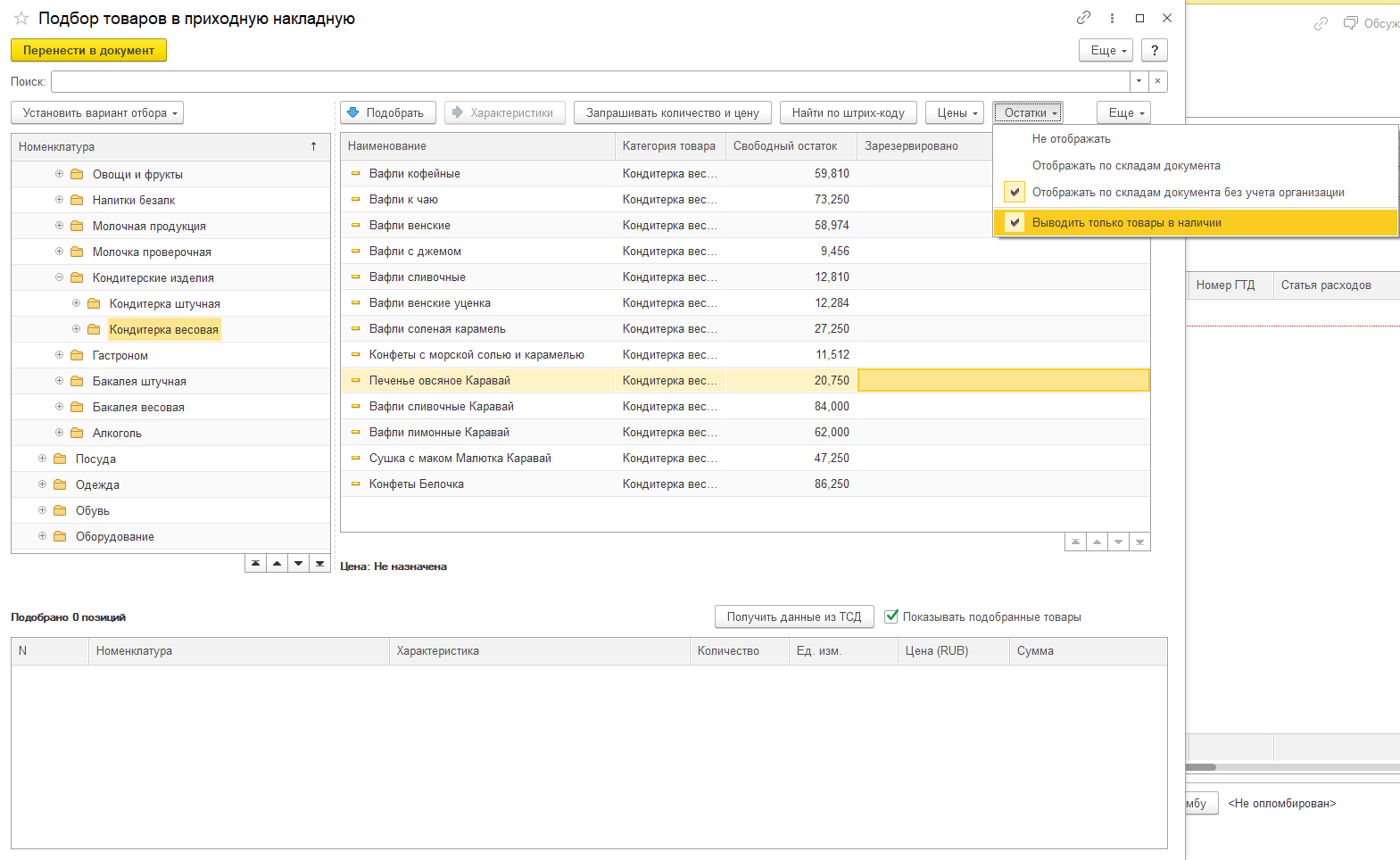 По кнопке «Перенести в документ» выбранные позиции номенклатуры добавляются в табличную часть документа.