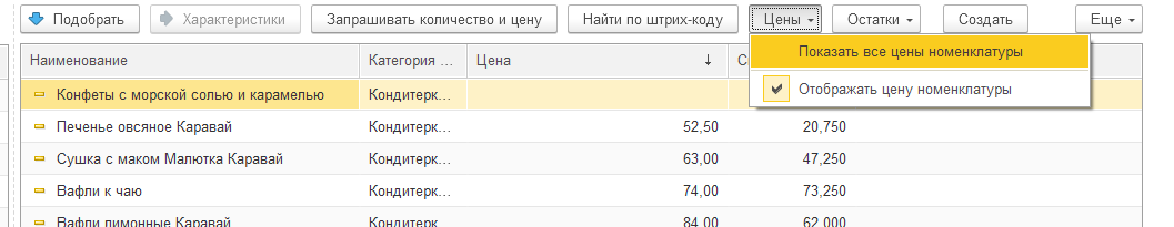 По экранной кнопке можно увидеть все категории цен, заданные на товар.