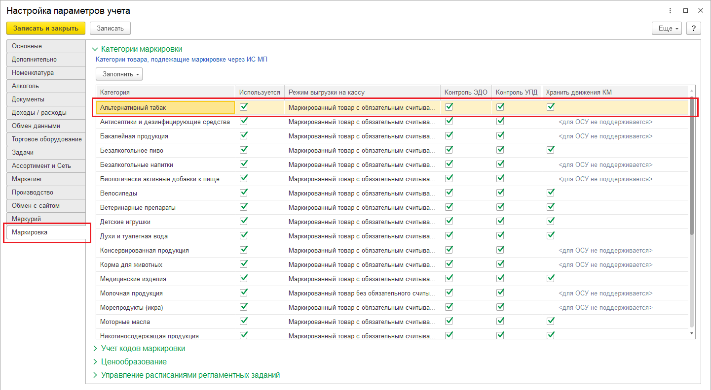 Для учета маркируемого альтернативного табака в Настройках параметров учета на закладке "Маркировка" установите соответствующую константу.