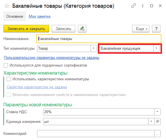 В карточке номенклатуры для бакалейной продукции используется категория товара с типом номенклатуры "Бакалейная продукция".