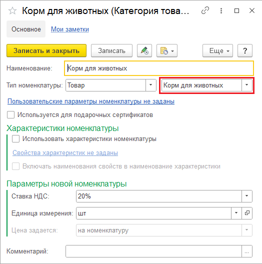 В карточке номенклатуры для кормов используется категория товара с типом номенклатуры "Корм для животных".