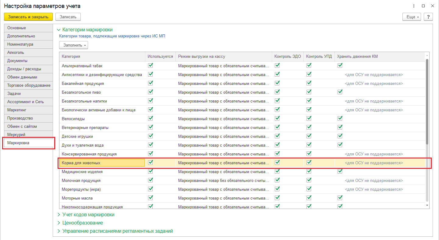 Для включения функционала маркировки кормов для животных, следует в Настройках параметров учета на закладке "Маркировка" установить соответствующую константу.