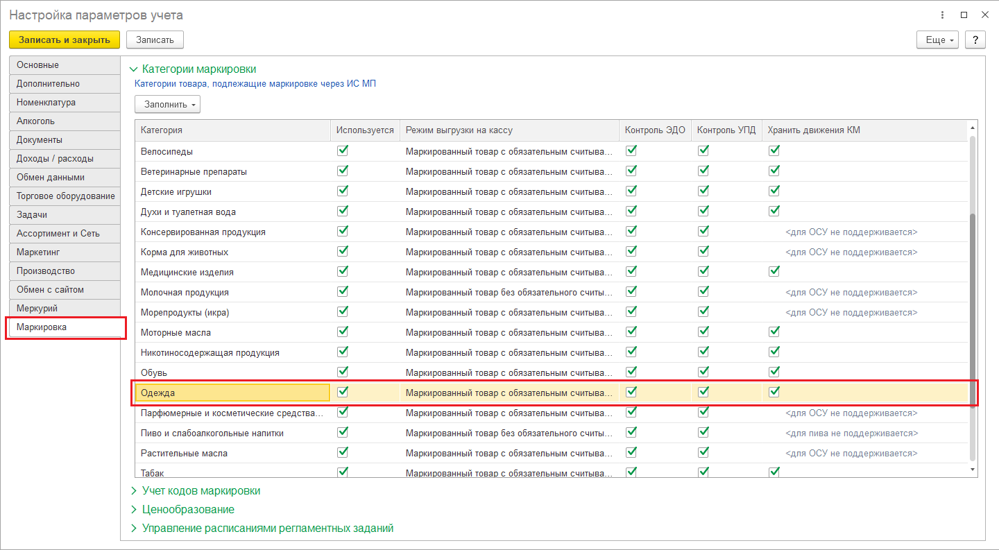 Для включения функционала маркировки легкой промышленности, следует установить соответствующую константу в Настройках параметров учёта.