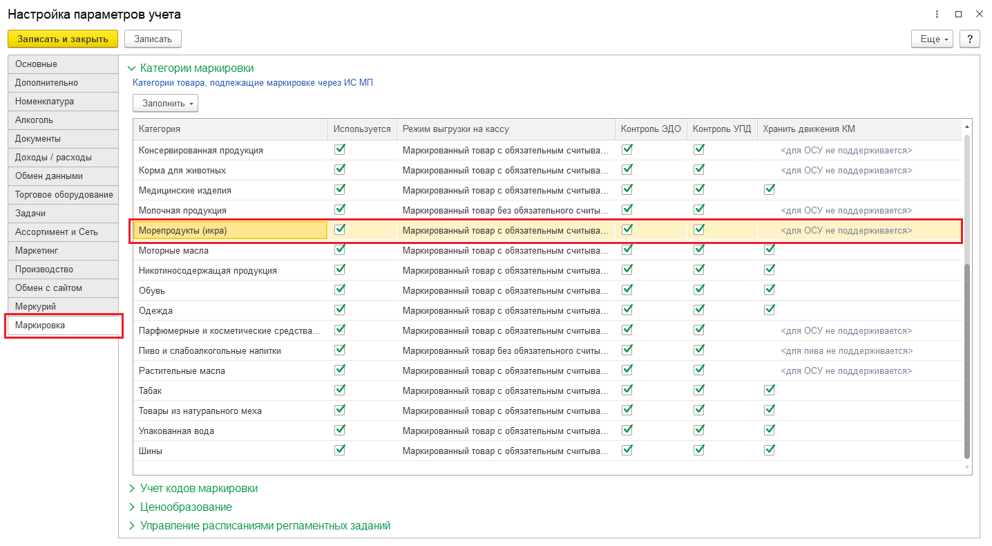 Для включения функционала маркировки морепродуктов, следует в Настройках параметров учета на закладке "Маркировка" установить соответствующую константу.