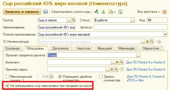 В карточке номенклатуры маркированной продукции необходимо корректно указать категорию товаров. В этом случае при продаже на кассе будет запрашиваться код маркировки.