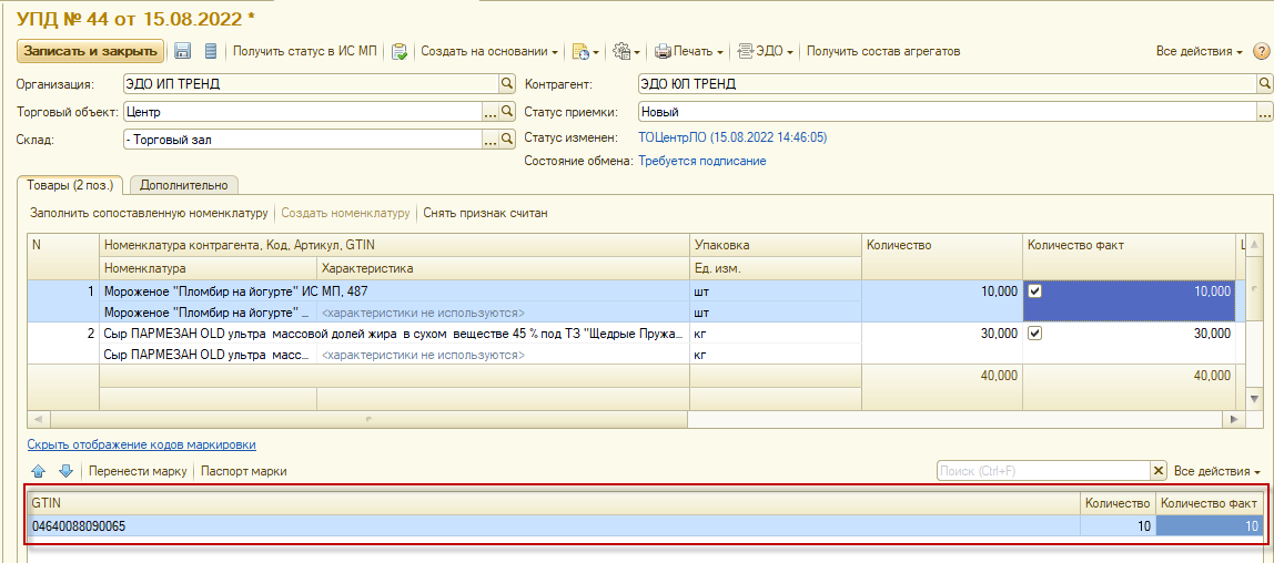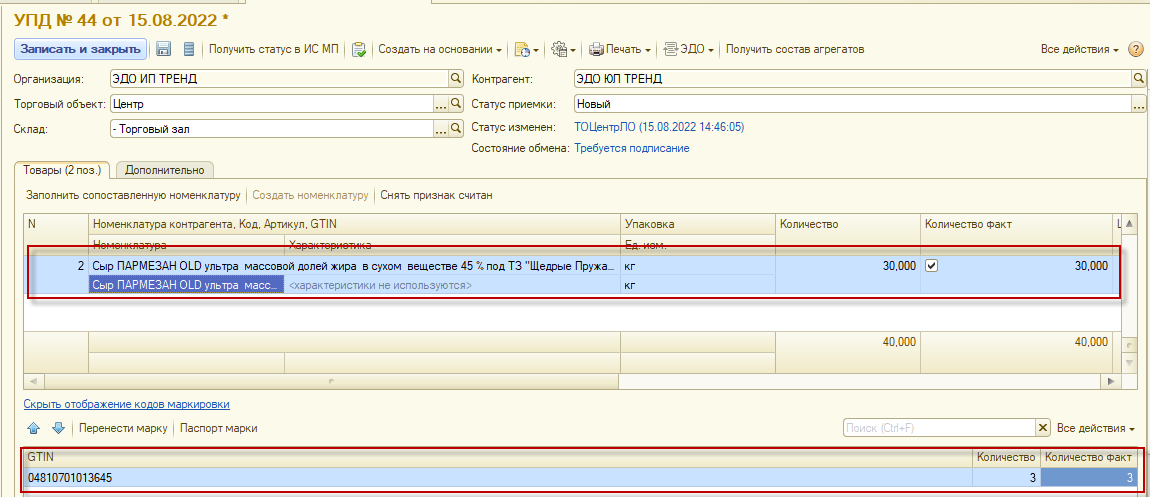 Отличие УПД передаваемой в рамках объемно-сортового учета заключается в том, что в нижней табличной части документа, отображается GTIN и общее количество кодов маркировки, с возможностью указать количество фактически пришедших.