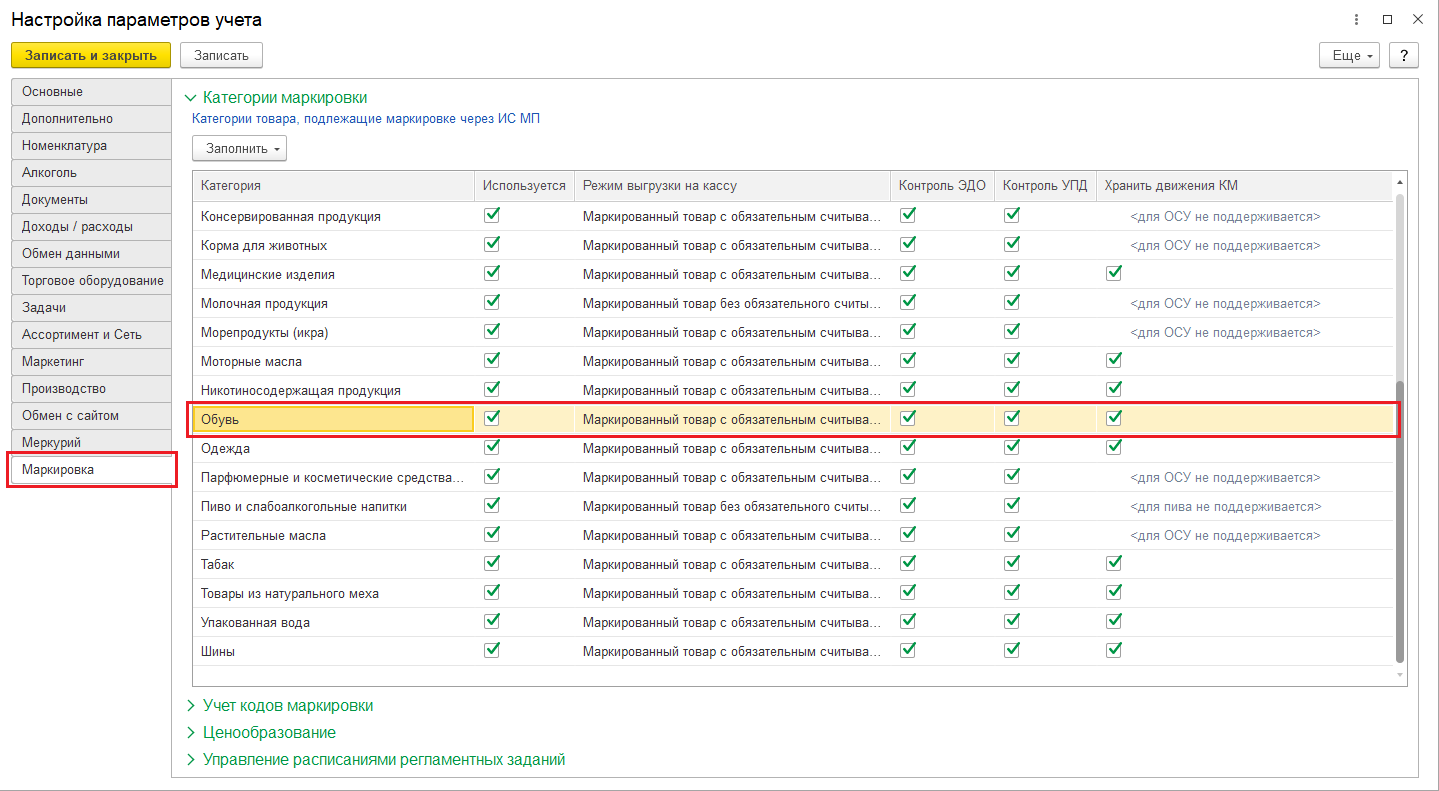 Для включения функционала маркировки обуви, следует установить соответствующую константу в Настройках параметров учёта.