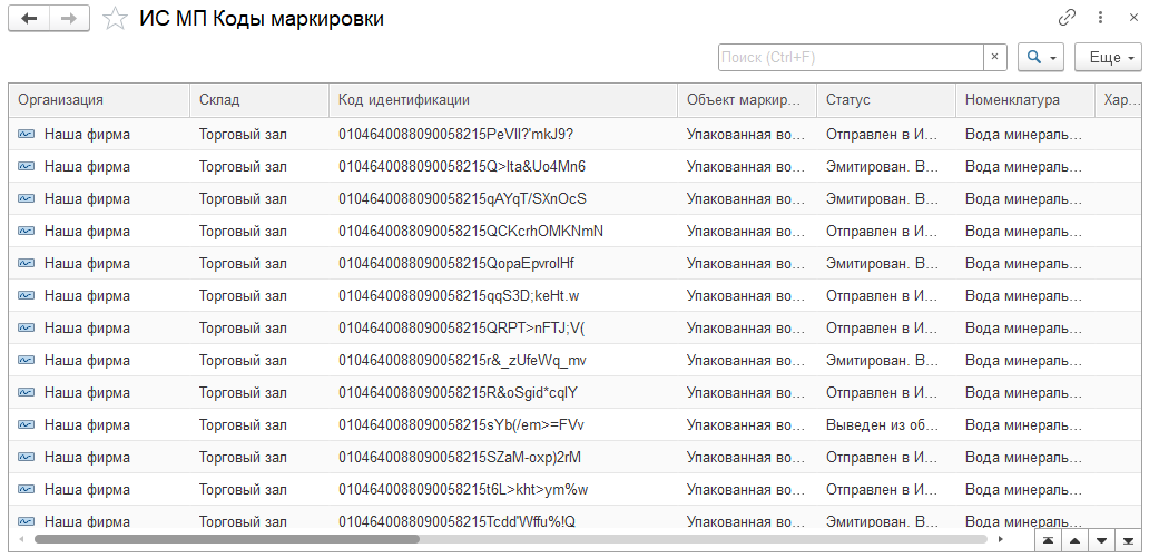 Информация по всем кодам маркировки (КМ), полученным в ДАЛИОН (через заказ КМ или через входящие документы ЭДО) хранится в регистре сведений "ИС МП Коды маркировки".