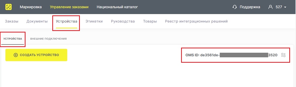 Далее переходим на закладку устройства. В верхнем правом углу таблицы устройств будет отображаться ваш OMS ID, скопируйте его.