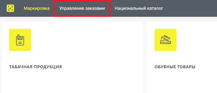 Для настройки вам необходимо войти в свой Личный кабинет в Честном знаке. В верхнем левом углу перейти на закладку "Управление заказами".