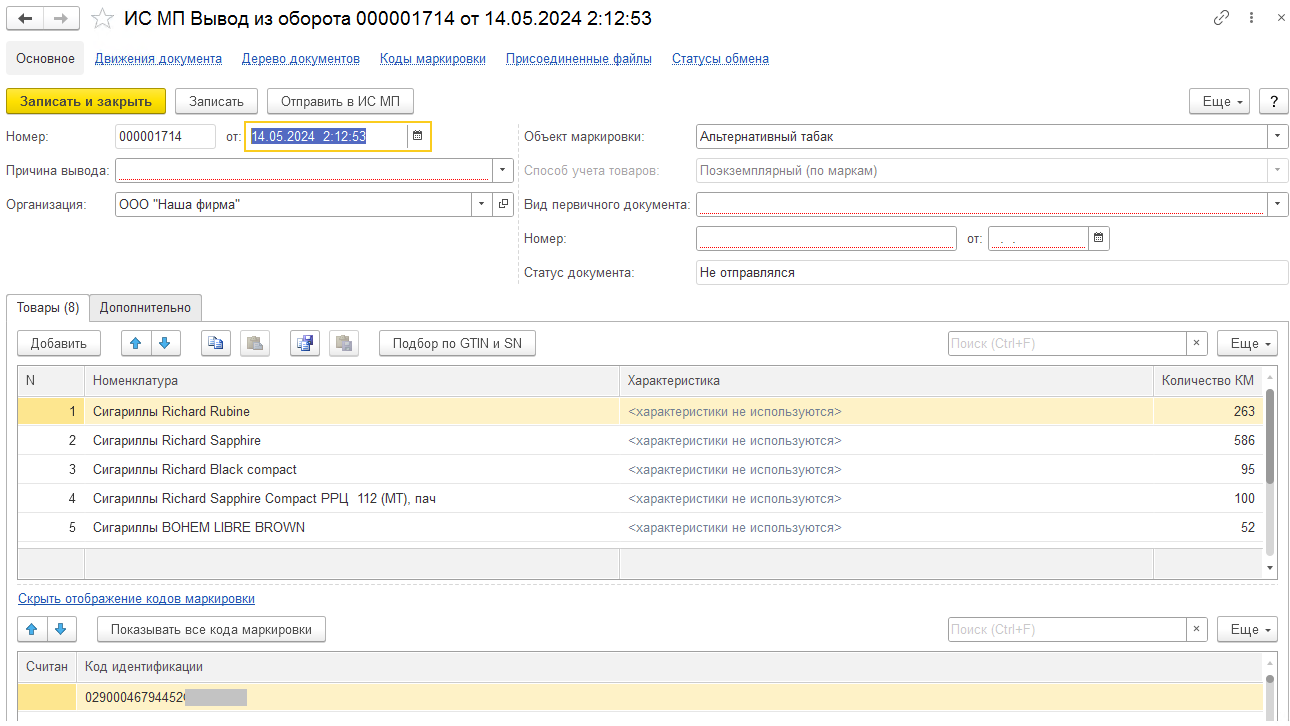 - Если будут присутствовать КМ, которые есть фактически, но нет в Честном Знаке, то они будут проигнорированы, информация по ним доступна в протоколе.