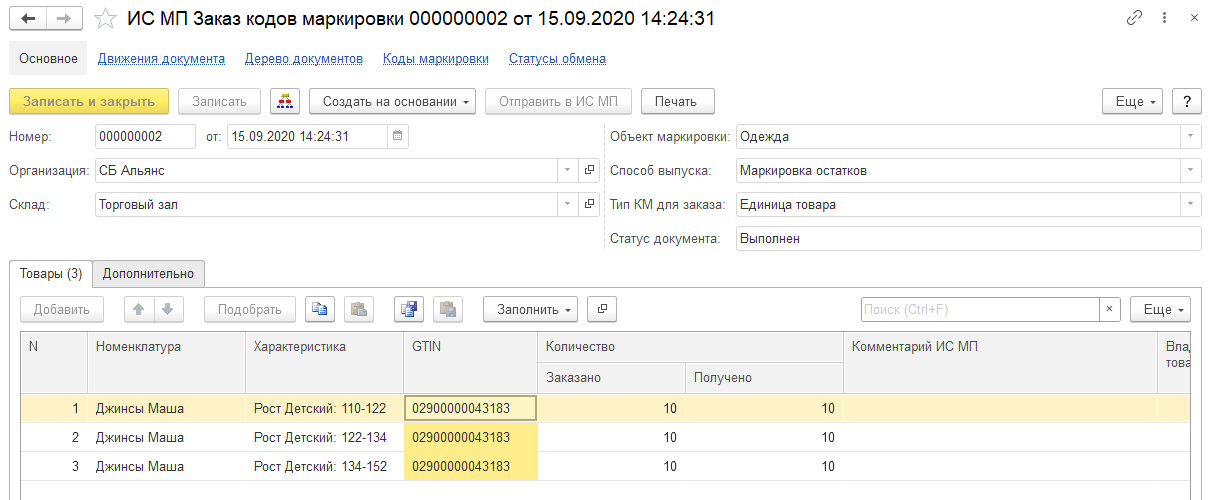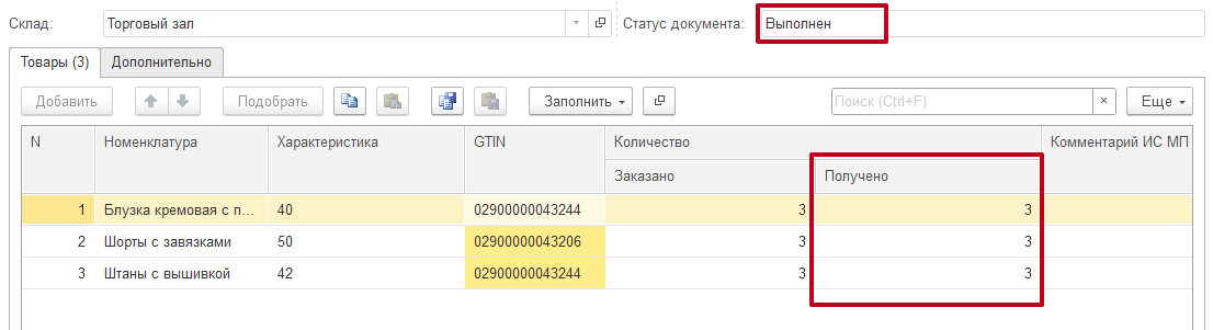 После получения ответа из ИС МП статус документа сменится на "Выполнен" и в ТЧ "Товары" будет заполнена колонка "Получено".