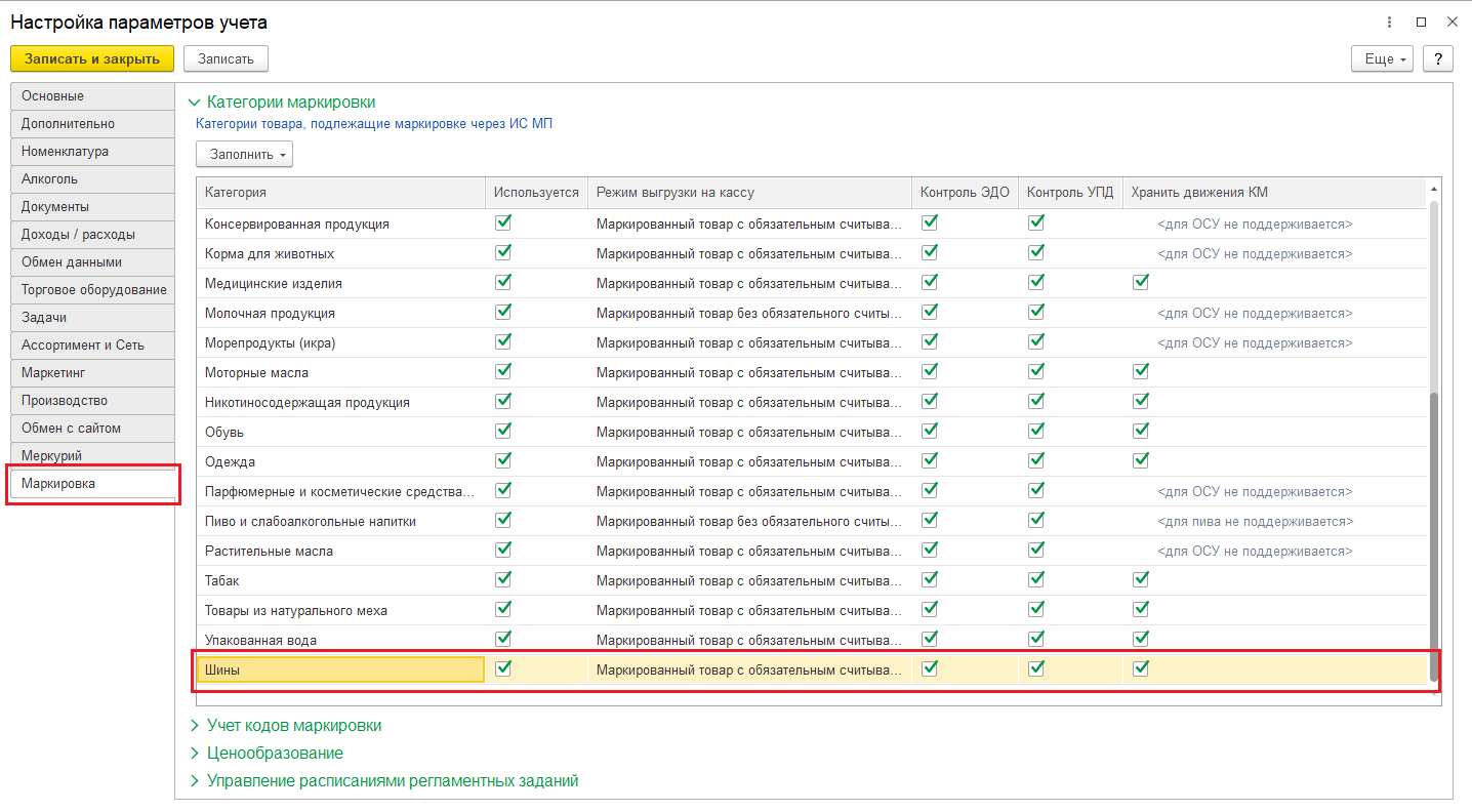 Для включения функционала маркировки шин, следует в Настройках параметров учета на закладке "Маркировка" установить соответствующую константу.