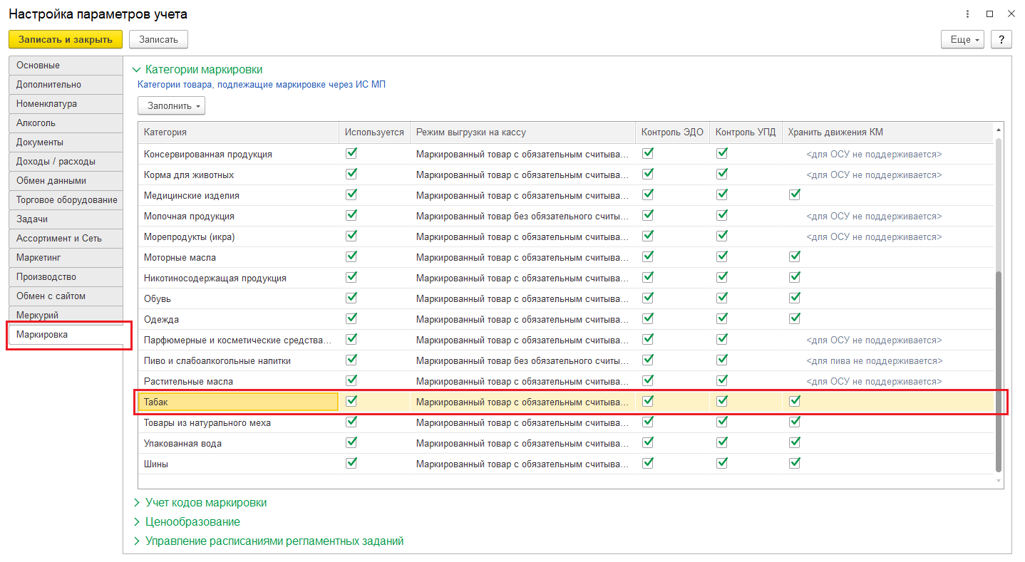 Для учета маркируемых табачных изделий в Настройках параметров учета на закладке "Маркировка" установите соответствующую константу.