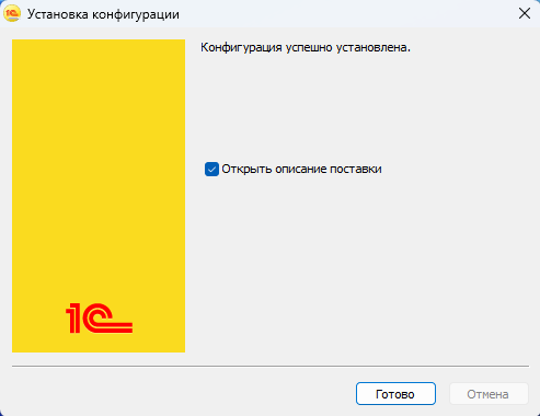 Если Вы хотите просмотреть описание поставки сразу после установки конфигурации, поставьте флажок «Открыть описание поставки».