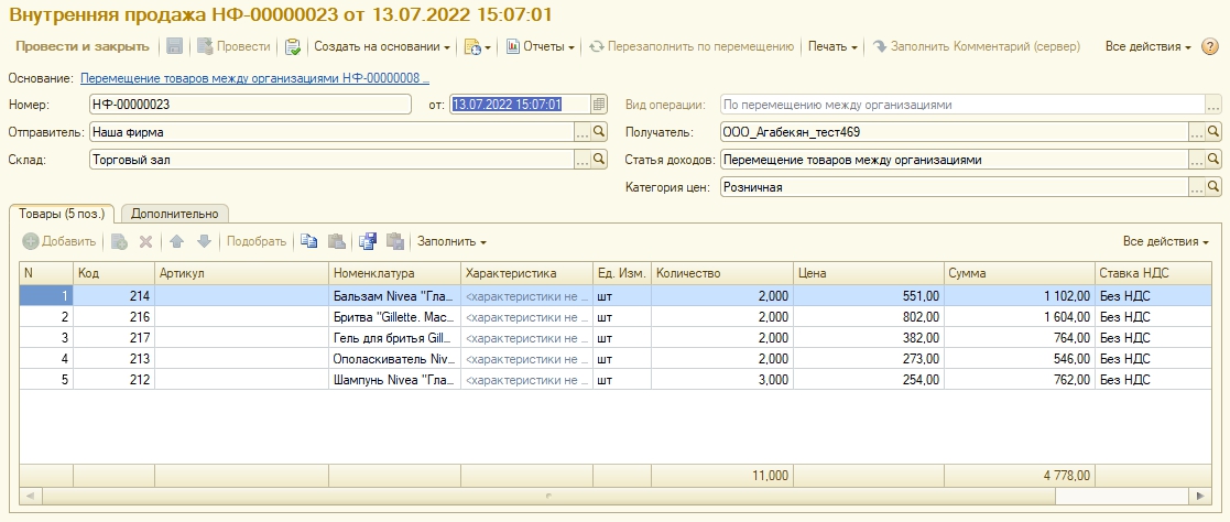 На основании перемещения между организациями, после подтверждения приемки автоматически формируется документ Внутренняя продажа с видом операции "Перемещение товаров между организациями". Такой документ делает движения только по регистру внутренних взаиморасчетов. Если выполняется отмена подтверждения, и изменяется документ перемещения, автоматического переформирования документа внутренней продажи не происходит. Пользователю необходимо скорректировать ее вручную. В документе внутренней продажи с видом операции "Перемещение товаров между организациями" доступна команда "Перезаполнить по перемещению".