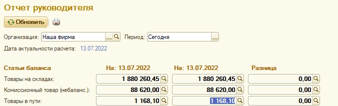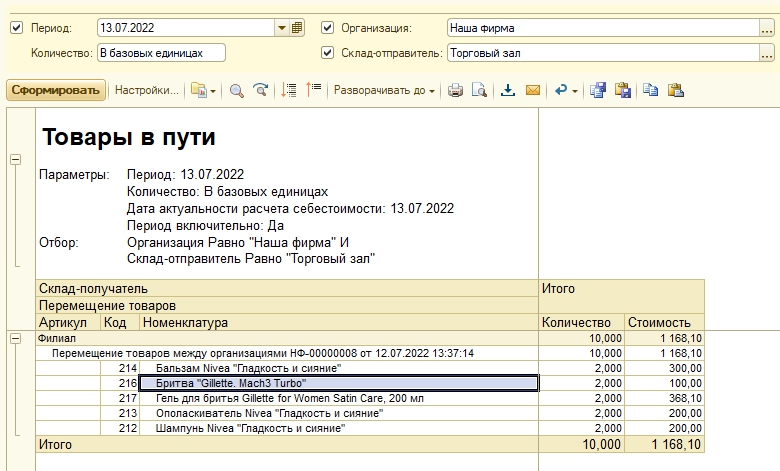 После проведения документа происходит списание товаров со склада-отправителя, и до момента осуществления приемки они приобретают статус «товары в пути», увидеть их можно в одноименном отчете.