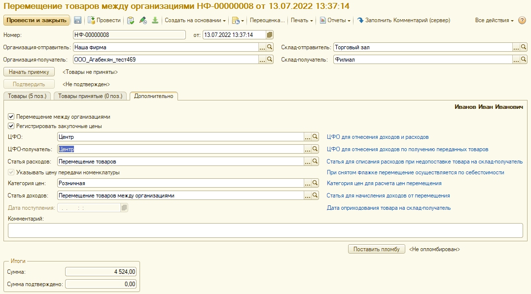 4. Подтверждение приемки формирует документ Внутренняя продажа