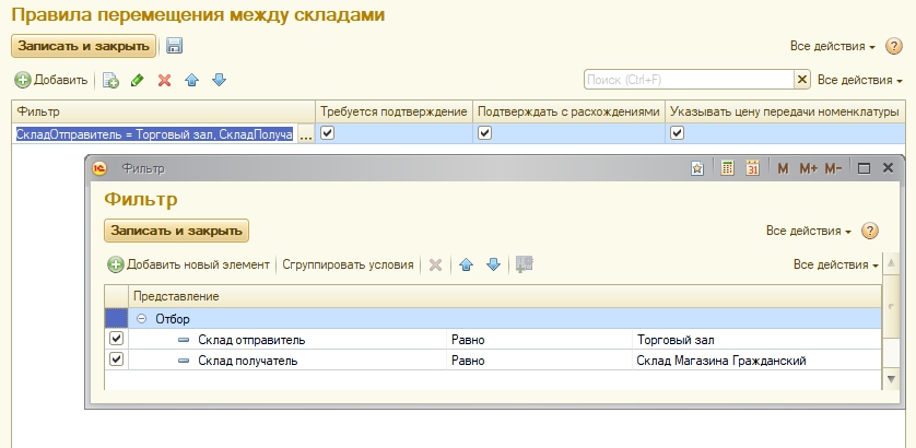 При создании документа перемещения с участием данных складов в него будут проставляться настройки, заданные правилом.