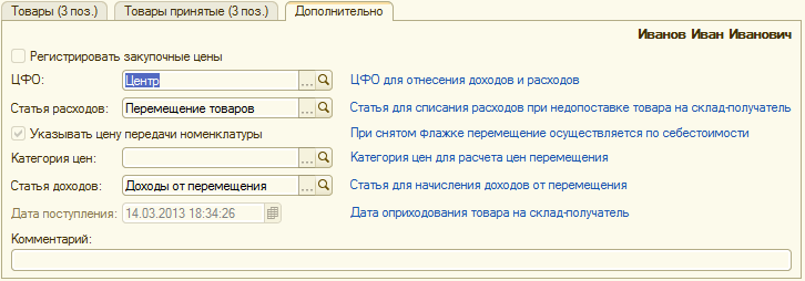 Если при приеме товара на складе-получателе будет найдено несоответствие между документально перемещенным товаром и фактически прибывшим, то расходы по недостаче упадут на ЦФО и Статью расходов, выбранные на закладке «Дополнительно».