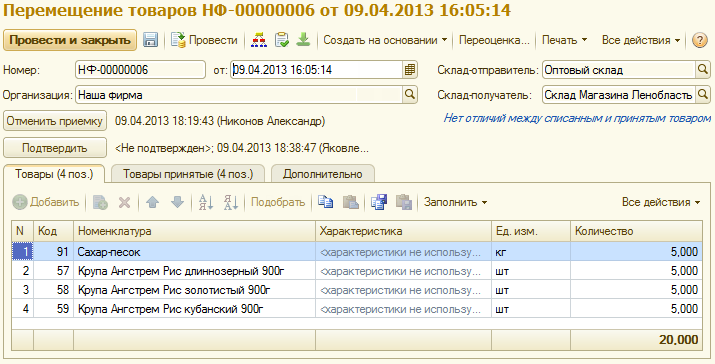 Если при перемещении произошла путаница и перемещенный реально товар отличается от заявленного на закладке «Товары» (например, произошел пересорт), на закладке «Товары принятые» в отдельных строках вписывается «новый» товар (т.е. тот, которого нет в исходных данных перемещения) с указанием его количества, цена такого товара указывается наиболее близкой к возможной для реально принимаемого товара (например если перепутаны йогурты разного вкуса, но одного типа — производитель, емкость, жирность и т.п. те же, то очевидно, что цена на него будет такая же, как на исходный товар; а вот если вместо водки привезли коньяк, то цена на принимаемый перемещенный товар должна соответствовать цене коньяка).