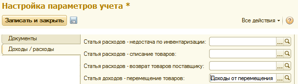 В настройках параметров учета на закладке «Доходы/расходы» администратором системы может быть выбрана статья, на которую всегда будут записываться доходы от перемещения товаров, и она будет автоматически подставляться в документы перемещения: