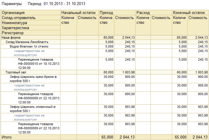 Перемещение по себестоимости. Если на закладке «Дополнительно» не проставлен флаг Указывать цену передачи номенклатуры, то товар между торговыми объектами будет перемещен по фактической себестоимости. Обратите внимание, что в оперативном периоде себестоимость не рассчитывается, она будет зарегистрирована в программе после проведения расчета финансового результата, который распределит товары по партиям.