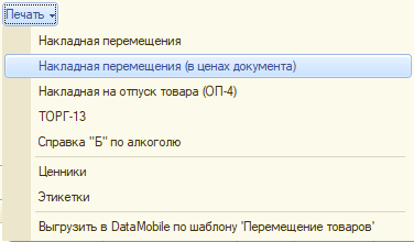 Для формирования печатной формы накладной на перемещение в ценах, указанных в документе, используется команда "Печать/Накладная перемещения (в ценах документа)", при этом на закладке "Дополнительно" должен быть установлен флаг Указывать цену передачи номенклатуры.
