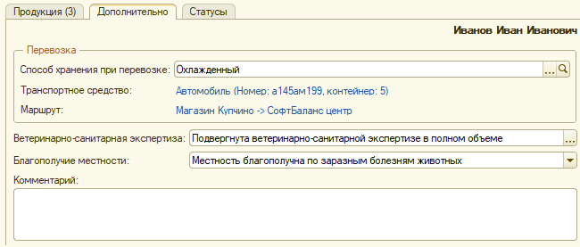 На закладке «Дополнительно» обязательно фиксируем данные о транспортировке продукции – способ хранения при перевозке, данные транспортного средства и маршрут. Указываем сведения о проведении ветеринарно-санитарной экспертизы и информацию о благополучии местности производства продукции.
