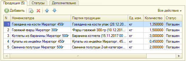 В ТЧ закладки «Продукция» можно увидеть статус каждого ВСД (колонка «Статус»). Карточка электронной ветеринарной справки открывается по двойному клику на строку.
