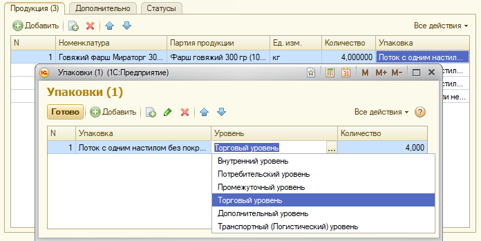 Выбор торговой площадки происходит по связи с хозяйствующим субъектом.- Упаковка. При добавлении упаковки необходимо указать уровень и количество. Подробнее об уровнях см. в справочнике «Упаковки».