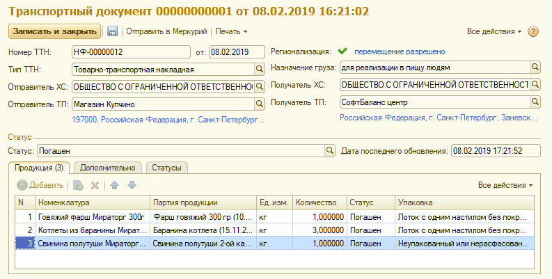 После успешной регистрации Транспортного документа в системе «Меркурий» для перемещаемой продукции заполняются ВСД и появляется возможность их распечатать по кнопке «Печать».