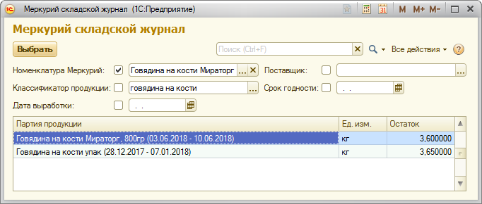 Партия продукции подбирается в документ через форму складского журнала, в которой выводятся текущие остатки организации, зафиксированные в системе «Меркурий». Для поиска нужной партии предусмотрен фильтр по номенклатуре Меркурий, 3 уровню классификатора продукции, поставщику, дате выработки и сроку годности.