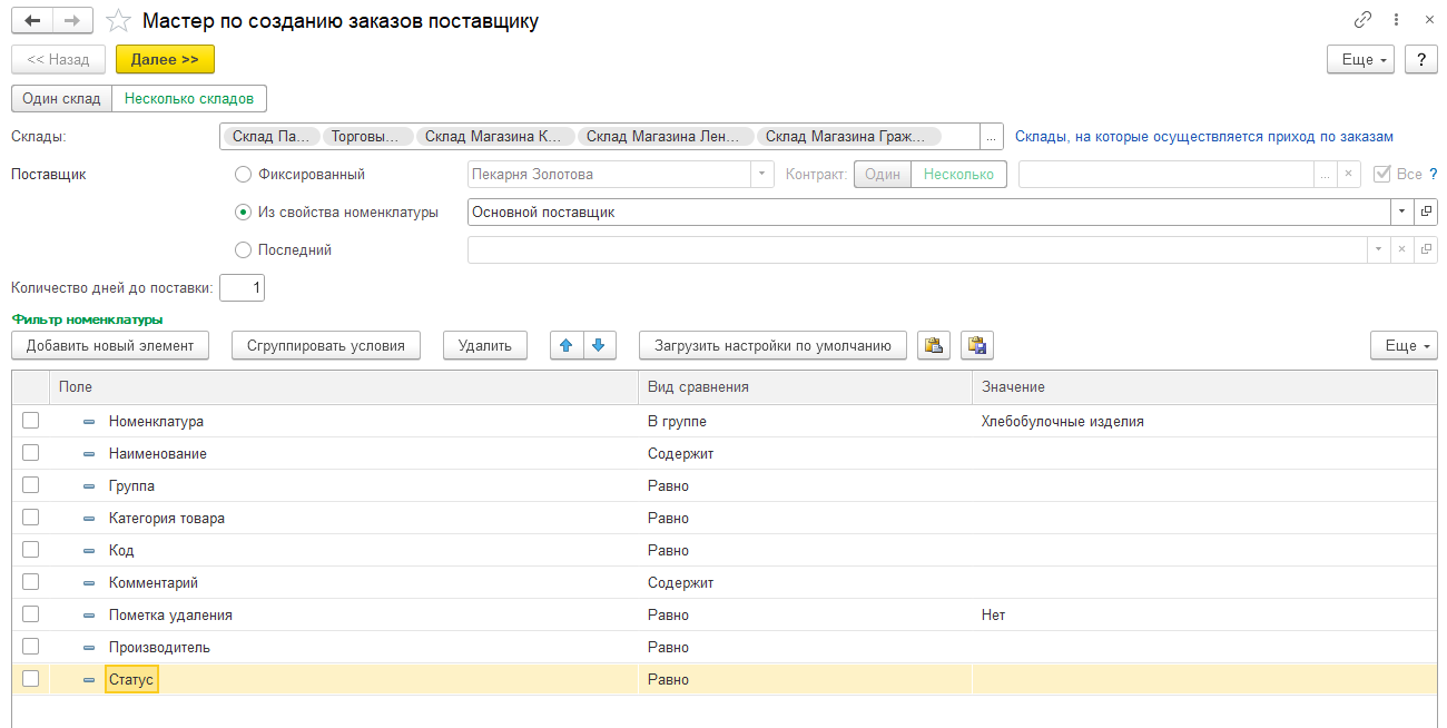 «Количество дней до поставки» необходимо указать, чтобы при расчетах учесть остаток товара, который будет на складе к моменту привоза новой партии. Также можно применить фильтр номенклатуры, чтобы заказывать только определенные товары.