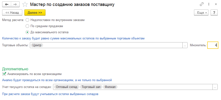 Количество товара для заказа будет рассчитано следующим образом — значения максимальных остатков выбранных торговых объектов суммируются, из них вычитается текущий остаток склада, на который делается заказ.